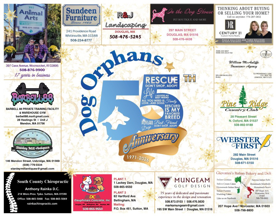 A very special thank you to our generous sponsors: R & J Landscaping | South County Chiropractic | Sullivan Real Estate | Dauphinais Concrete Pine Ridge Country Club | Barbell 88 | Animal Arts Grooming | McAuliffe Insurance | Stanley Mill Antiques Mungeam Golf | Webster First | Sundeen Furniture | In The Dog House | Giovanni’s Italian Bakery & Deli